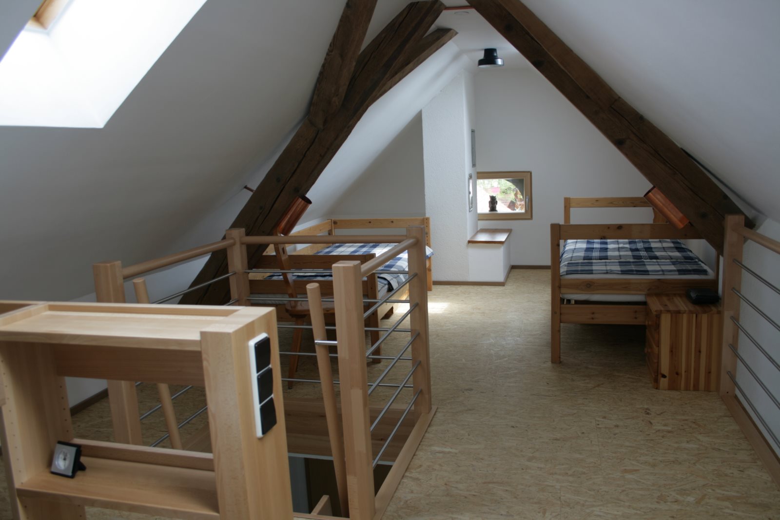 Die Galerie mit 3 weiteren Betten ist über die Holztreppe erreichbar.