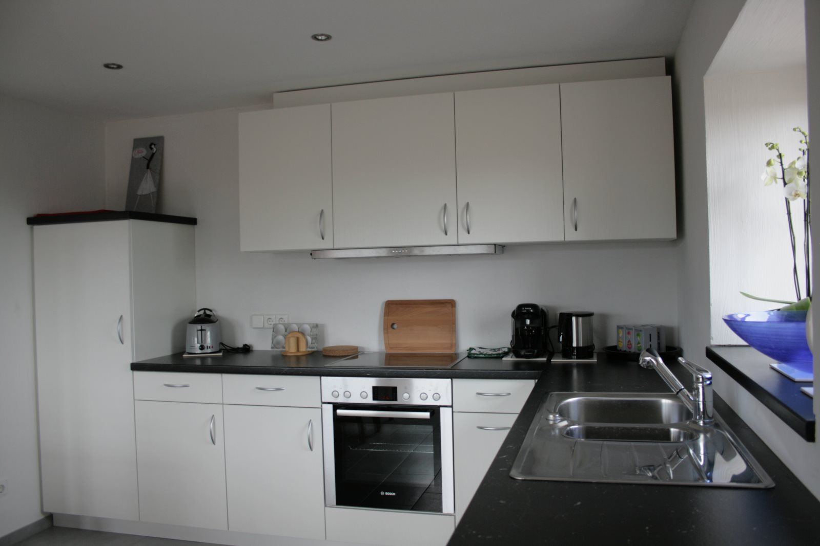 Einbauküche, komfortabel ausgestattet mit Geschirrspülmaschine, Kühl- und Gefrierschrank, Ceran-Kochfeld mit Dunstabzug und Backofen, Mikrowelle, Kaffee-Maschine, Wasserkocher und Toaster.